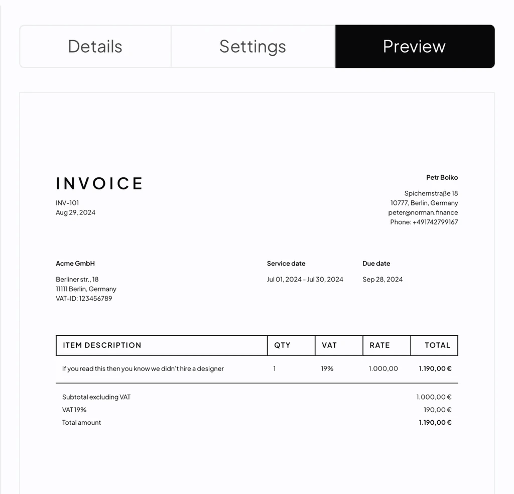 Norman wurde dafür entwickelt, Steuern, Buchhaltung, Rechnungen und Belege an einem Ort zu verwalten. So kannst du dich stärker auf dein Business konzentrieren und weniger auf administrative Aufgaben.
